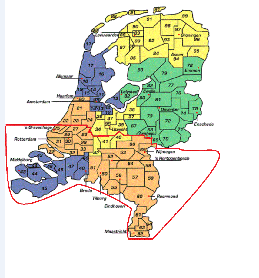 Kersten levert binnen kantoortijd in heel Nederland, behalve de eilanden. cijfers zijn de eerste 2 van de postcode gebied) Drie gebieden (zie niet naar de kleuren in het kaartje): - Overig - Eilanden - Rood omrande gebied uitzondering op schema bij AD materiaal Rood omrand gebied: Reparatieverzoek wordt wel gedaan en door Leeuwarden geregeld. Deze melding kan doorgegeven worden aan de bereikbaarheids dienst. (volg voor het contactformulier het groene gebied). Levering AD materiaal wordt (nog ) niet gedaan buiten kantoortijden. Levering binnen kantoortijden wel en daarvoor mag het geïndiceerd en besteld Spoedbezorging AD materiaal buiten kantoortijd: Doorverwijzen naar Medipoint: 088 102 0100 Ophalen Spoedophalen wordt binnen het rood omrande gebied niet gedaan. Overig gebied alleen bij grote uitzondering en alleen i.o.m. chauffeur: bij overlijden en opbaren thuis en er anders absoluut geen ruimte is. Familie mag ook het bed zelf uit elkaar halen, als dit mogelijk is. NIETS TOEZEGGEN BIJ OPHALEN!